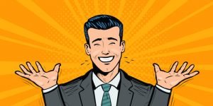 Happy businessman or student rejoices at success. Business concept. Cartoon in pop art retro comic style, vector illustration